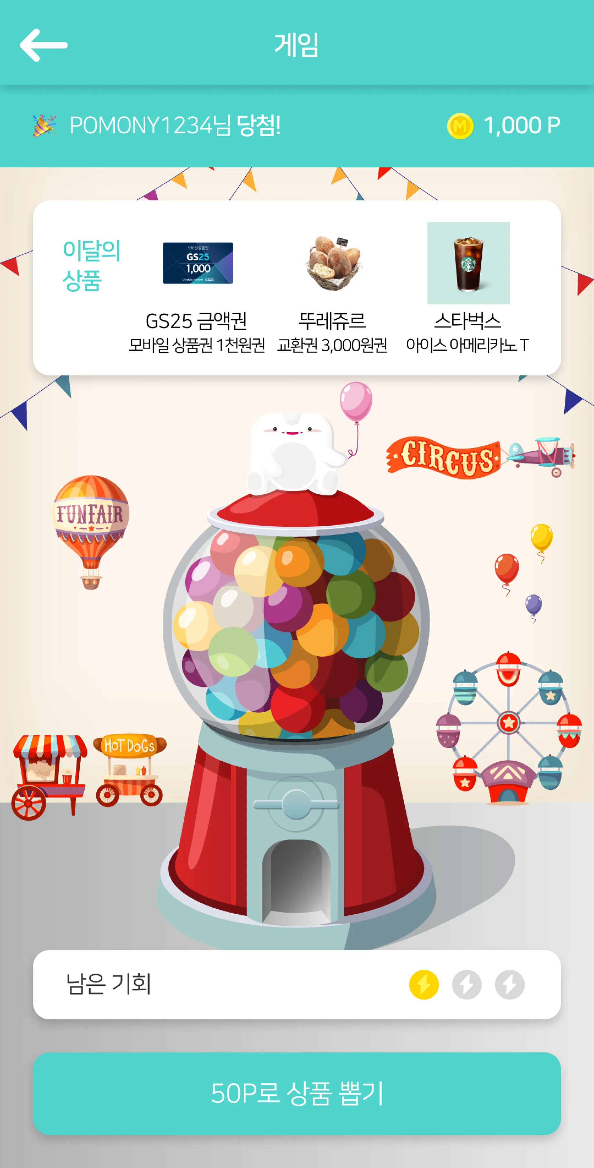 참여 방법: 50P로 상품뽑기