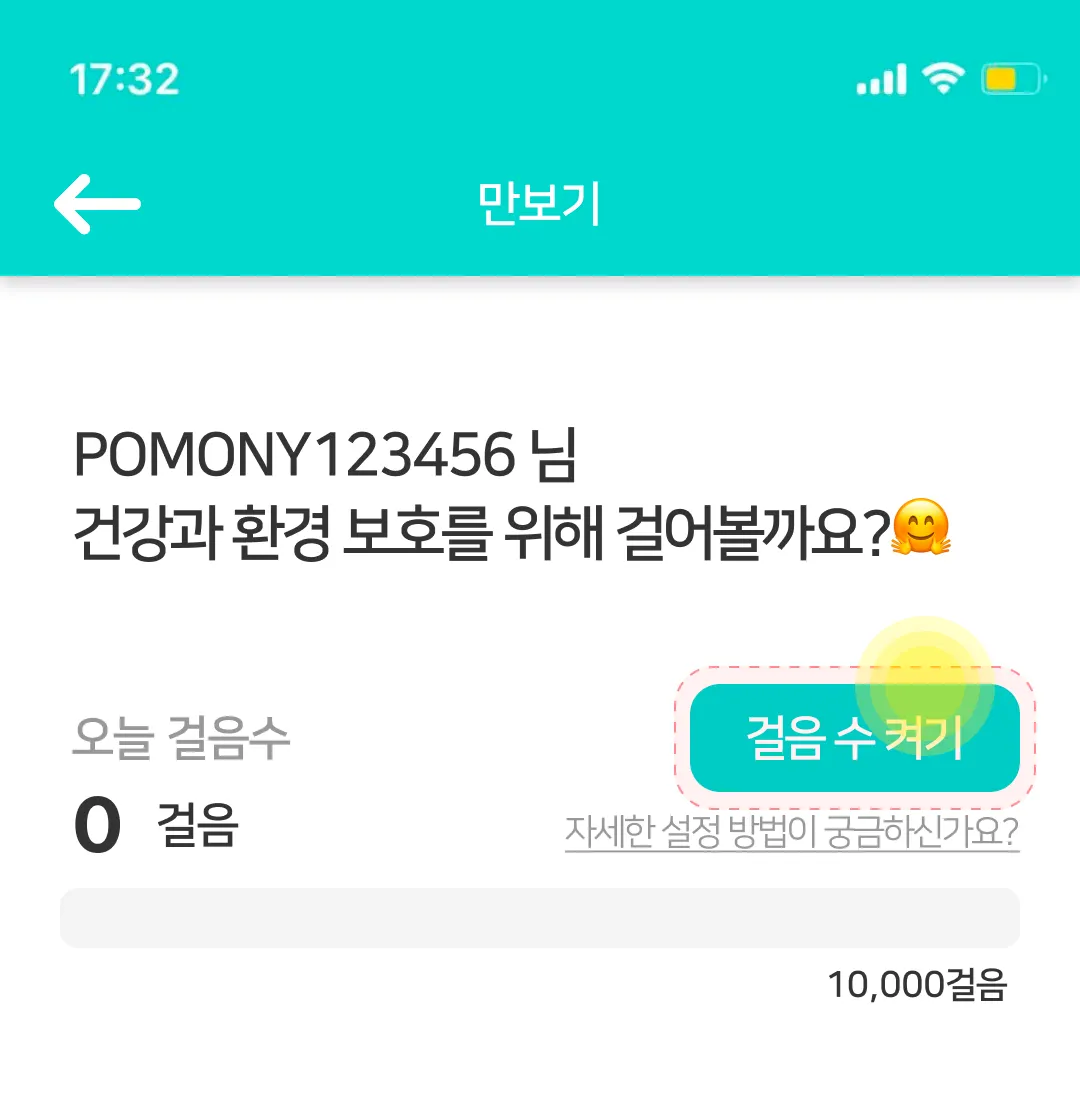 당황하지 않고 우측의 걸음 수 켜기 버튼을 눌러주세요. 그리고 하단의 안내를 차근차근 따라와주세요.