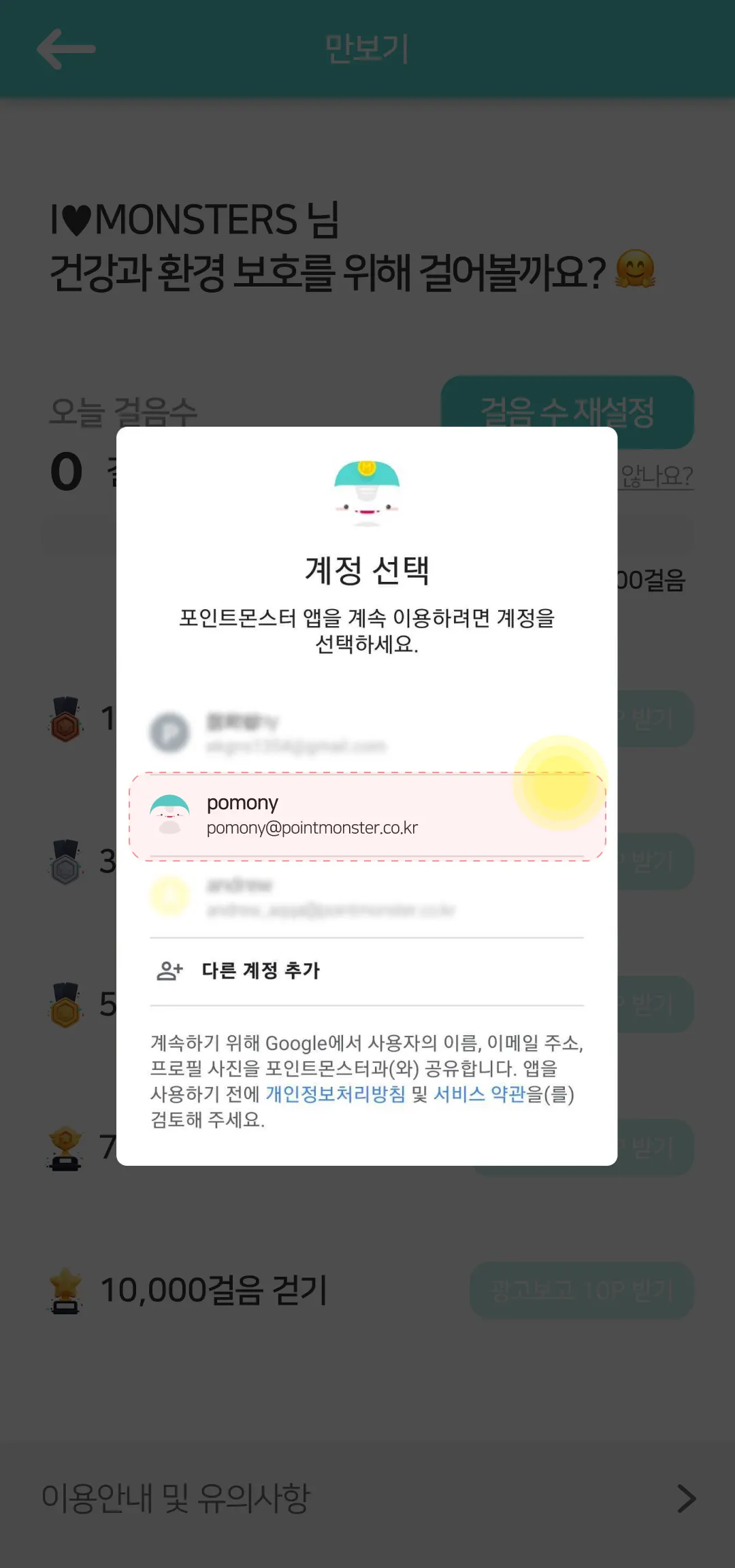 Step 2. 포몬 만보기에서 구글 피트니스에 가입한 계정을 선택한다