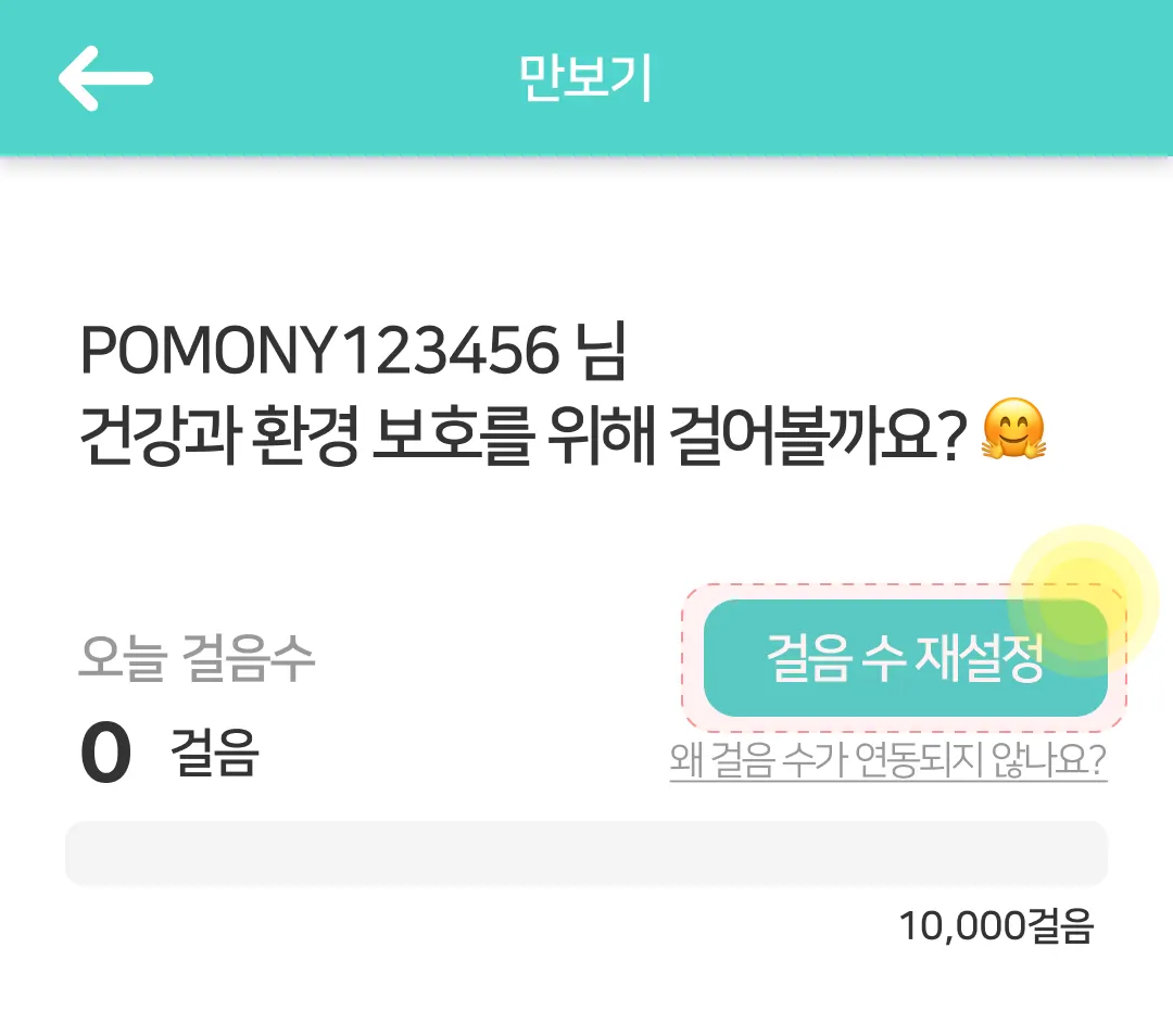 만보기 페이지 - ‘걸음 수 재설정’ 버튼 선택 → Step 2. 다시 도전!